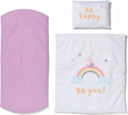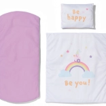 Perna, păturica și salteluța pufoase, cu inscripții vesele și motive de curcubeu, permit schimbarea aspectului pătuțului după dispoziție.