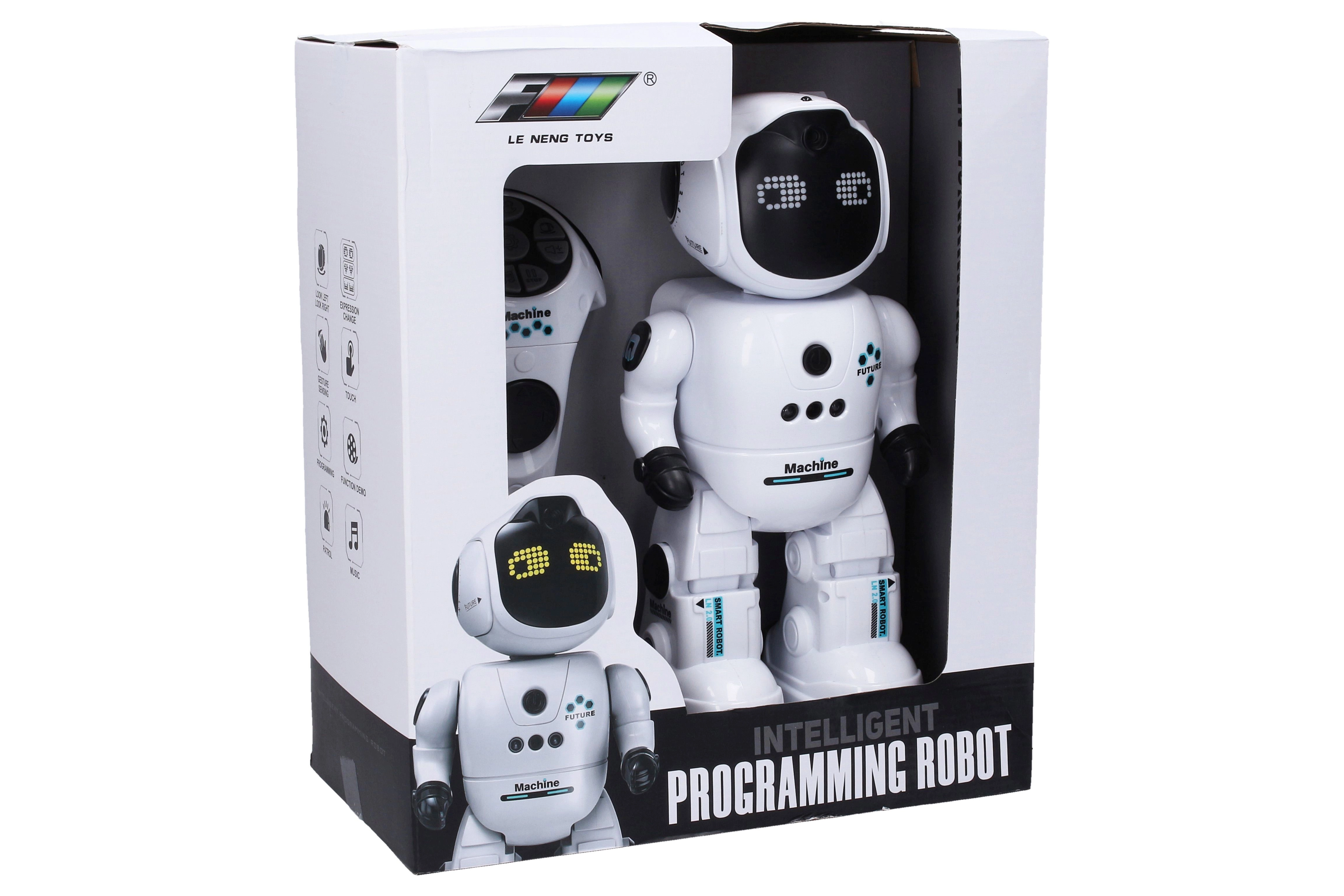 Robot RC amuzant și interactiv, cu înălțimea de 26 cm, oferă control prin gesturi, funcții tactile și telecomandă. Bucurați‑vă de efecte luminoase și sonore, expresii faciale schimbătoare și posibilitatea de programare a mișcărilor. Pachetul include cablu de încărcare USB și baterie Li‑ion 3,7 V / 500 mAh pentru robot.