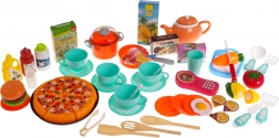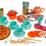 Cuptor, frigider, mașină de spălat vase, espressor, telefon și zeci de accesorii: oale, tigaie, ustensile, băuturi, alimente cu scai și carduri cu rețete. Totul pentru o bucătărie de joacă completă.