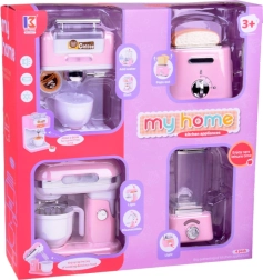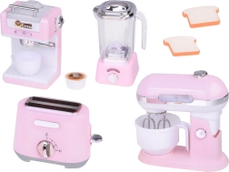 Setul de electrocasnice de bucătărie mici aduce în bucătăria de jucărie a copilului dumneavoastră eleganță și funcționalitate. Fabricat din plastic de calitate cu detalii care imită perfect aparatele reale. Culoarea roz pal cu accesorii albe și cromate conferă jucăriilor farmec și stil.