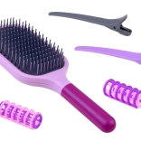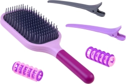 Separați șuvițele cu clemele, descurcați părul cu peria și modelați-l cu bigudiurile – instrumente simple și sigure pentru mâini micuțe.