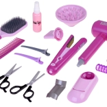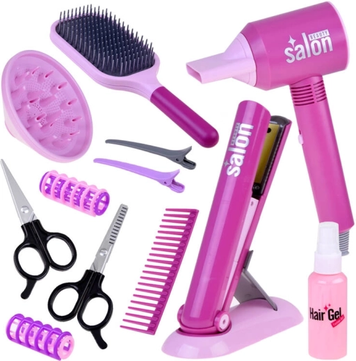 Uscătorul, placa de păr, perii, pieptenii, clemele, bigudiurile și foarfecele – tot ce are nevoie micul coafor pentru a crea coafuri acasă sau în călătorii.