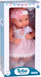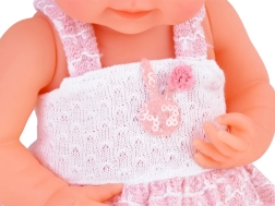 Chipul prietenos al păpușii invită la joacă. Bebelușul este îmbrăcat într-o rochiță alb-roz decorată cu un volănaș cu ciucure și dantelă. Deși bebelușul nu are păr, capul îi este împodobit cu o bentiță din tul, cu fundă și perluțe. Pe picioare are șosete albe.