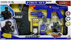 - Pușcă M4 cu mecanism de armare, revolver electric .357, cuțit de luptă din cauciuc, vestă tactică, stație radio, insignă de poliție, toc pentru armă, cătușe, fluier