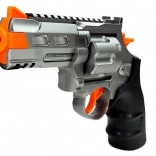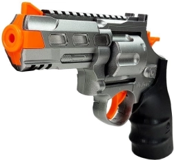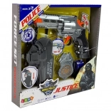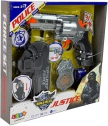 Acest set de poliție este ideal pentru carnaval, jocuri tematice și aventuri de zi cu zi. Revolverul în combinație de culori argintiu și negru emite la apăsarea trăgaciului și la reîncărcare un sunet de împușcătură, însoțit de un efect luminos, făcând jocul și mai realist. Copiii își dezvoltă cu ușurință imaginația, abilitățile de role-play și interacțiunea socială.
