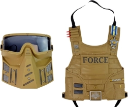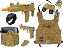 .Datorită accesoriilor, copilul se poate echipa cu vestă antiglonț, busolă, pistol și poate porni în „misiune”. Mitraliera, care este partea principală a setului, are o întindere specială care simulează tragerea. După o serie de focuri, arma trebuie reîncărcată. Binoclul permite observarea inamicului de la distanță. Toate accesoriile sunt realizate din plastic de înaltă calitate, garantând că vor servi copilului dumneavoastră mult timp. Schema de culori este verde deschis.