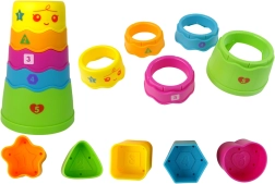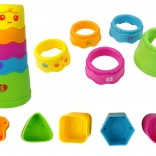 - Piramidă cu 5 niveluri cu orificiu pentru bile – asamblați de la cel mai mic la cel mai mare.