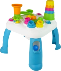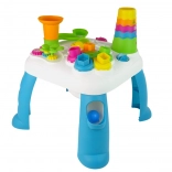 Măsuța educațională interactivă în alb-albastru este concepută pentru ca cei mici să își dezvolte abilitățile într-un mod distractiv. Datorită efectelor luminoase la introducerea formelor, elementelor colorate și pistei pentru bile, copiii exersează coordonarea mână–ochi, logica și imaginația. Picioarele detașabile permit joaca pe covor sau la pătuț, iar panoul poate fi fixat de cadrul pătuțului cu ajutorul curelelor.