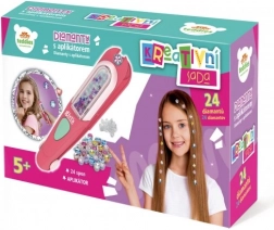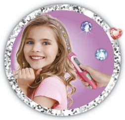 Acest set distractiv le permite copiilor să creeze accesorii originale pentru păr fără lipici și fără murdărie. Procedura este simplă: introduce diamantul în partea superioară a aplicatorului, agrafa în partea inferioară, așază un șuviță subțire de păr și apasă – diamantul rămâne fixat cu ajutorul agrafei. Ușor, rapid și eficient.
