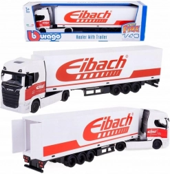 Model metalic de camion realizat realist la scara 1:43, oferă o cabină detaliată Scania 770 S și o semiremorcă lungă. Modelul BBURAGO impresionează prin construcția metalică de calitate, detalii fine și designul atrăgător Eibach pe remorca albă. O alegere excelentă pentru colecționari sau ca un cadou stilat.