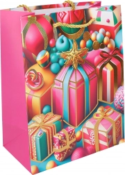 Pungă cadou de Crăciun, stilată, mărimea S (23 × 18 × 10 cm), pentru ambalarea rapidă și elegantă a cadourilor. Oferă 4 variante festive, este rezistentă, practică și potrivită pentru cadouri mici până la medii.