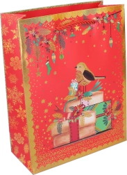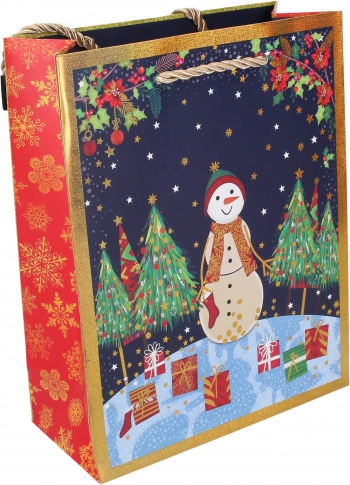 Pungă cadou de Crăciun stilată, mărimea L, cu dimensiunile 42 × 31 × 12 cm, ideală pentru ambalarea cadourilor mai mari. Oferă 4 modele festive, construcție rezistentă și mâner confortabil pentru transport ușor.