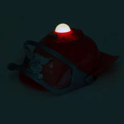 Casca este concepută să arate ca o cască de pompier adevărată, incluzând o insignă decorativă și culoarea roșu aprins.