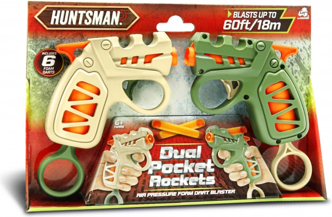 Setul compact de pistoale de buzunar HUNTSMAN aduce distracție plină de acțiune pentru doi jucători. Cu lungimea de 13 cm și o rază de tragere de până la 18 m, încântă atât în interior, cât și în aer liber. Încărcarea este ușoară – introduceți proiectilul în țeavă, armați pistolul cu inelul și trageți apăsând pe trăgaci. În pachet găsiți 2 pistoale și 6 proiectile din spumă.