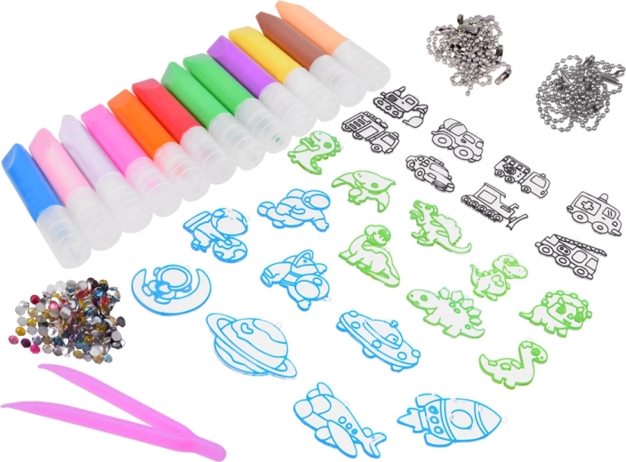 Descoperiți distracție nesfârșită cu setul creativ pentru micii artiști! Creați propriile brelocuri cu motive din spațiu, dinozauri și mașini folosind 24 de șabloane din cauciuc, 12 culori și pietricele strălucitoare. Datorită pensetei incluse și lanțurilor metalice, creația este ușoară, curată, iar rezultatele sunt frumos precise.