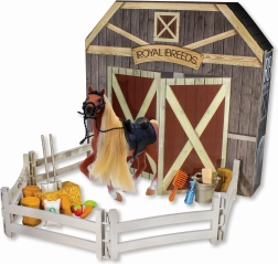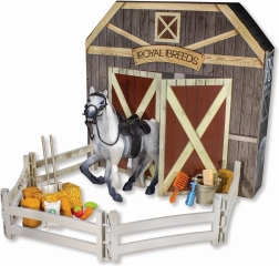 Acest set conține cal Royal Breeds cu o dimensiune de 17 cm și elemente interactive care vor captiva orice copil. Partea din spate deschizabilă a ambalajului extinde posibilitățile de joc și se transformă în grajduri: