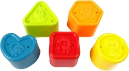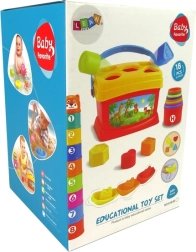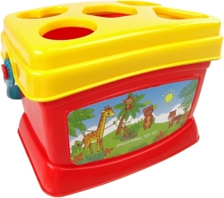 Găleata cu capac servește ca un sorter de forme cu motive de animale, permițând jocuri interactive și recunoașterea formelor și culorilor.
