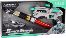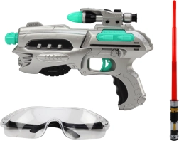Acest set cosmic transformă orice misiune pentru copii într-o experiență de neuitat. Pistolul futurist cu efecte luminoase și sonore îi poartă pe copii în „bătălii spațiale”, în timp ce sabia luminoasă roșie, cu lungime de până la 80 cm, iluminează fiecare aventură. Ochelarii de protecție completează echipamentul și oferă senzația unui adevărat războinic spațial.