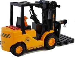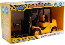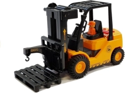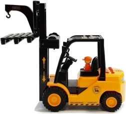 Stivuitorul realist pentru copii, în culoare portocalie, oferă furci mobile, un cârlig practic pentru încărcătură și efecte de lumină și sunet interactive. Datorită roților din cauciuc, deplasarea este lină și stabilă, susținând dezvoltarea motricității și jocul creativ.