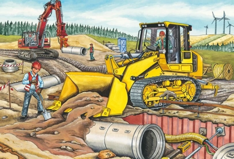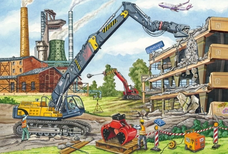 Set amuzant de trei puzzle-uri cu teme ale unui șantier aglomerat de la marca SCHMIDT. Fiecare puzzle are 48 de piese și, după asamblare, măsoară aprox. 26,3 × 17,8 cm – ideal pentru copiii care iubesc utilajele de construcții și puzzle-urile de calitate.