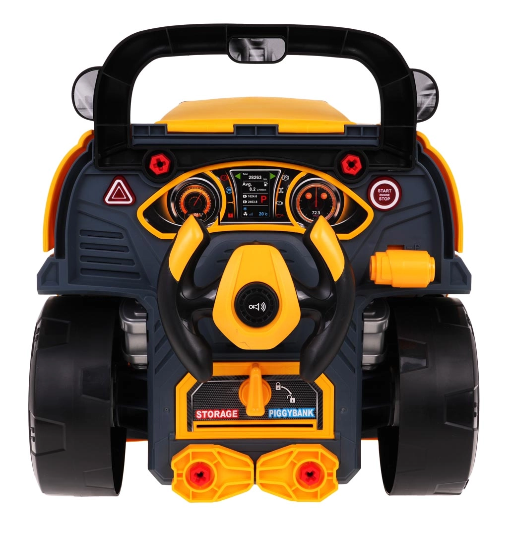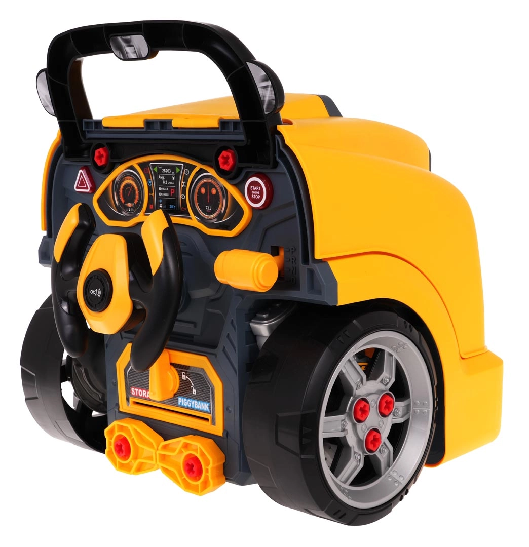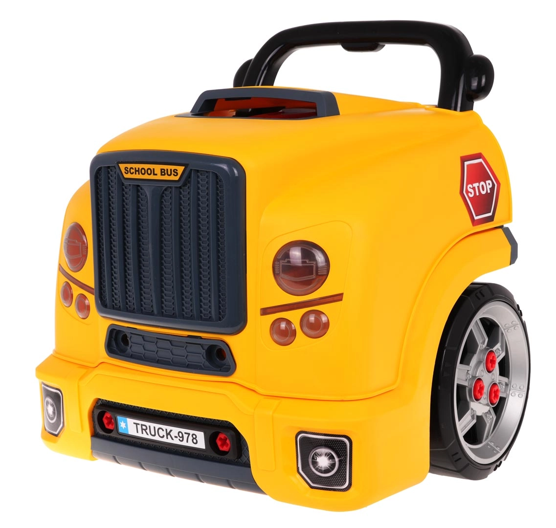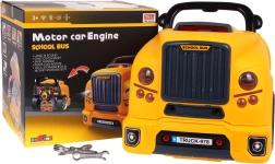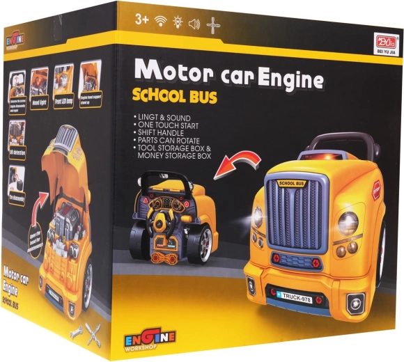 Jucărie interactivă, autobuz școlar galben cu partea frontală dotată cu capotă rabatabilă și bord, concepută pentru copii de la 3 ani. Setul include piese pentru asamblarea părții frontale a autobuzului și unelte necesare pentru montarea și demontarea componentelor, precum șurubelniță și chei. Sub capota autobuzului se află un motor mare detașabil, pe care copilul îl poate demonta. Se pot înlocui și bujiile și roțile. Pe bord se află un buton de pornire a vehiculului cu sunete de aprindere a motorului, un volan cu claxon și o sirenă de urgență. Sub volan se află un spațiu de depozitare în care pot fi păstrate toate uneltele, șuruburile și butoanele necesare. Jucăria are un mâner comod pentru transport. Alimentare cu 3 baterii AA 1,5 V (nu sunt incluse). Această jucărie pentru micii mecanici auto dezvoltă îndemânarea manuală, motricitatea fină și coordonarea mână-ochi. . Funcții: . - capotă rabatabilă a autobuzului, . - motor rotativ, . - sunete de aprindere a motorului, mers înainte, mers înapoi, .- claxon pe volan, .- sirenă de urgență, .- faruri care se aprind, .- lumini ale motorului, .- compartiment pentru unelte, .- levier de viteze, .- mâner confortabil pentru transport, .- ghidon mobil, . |