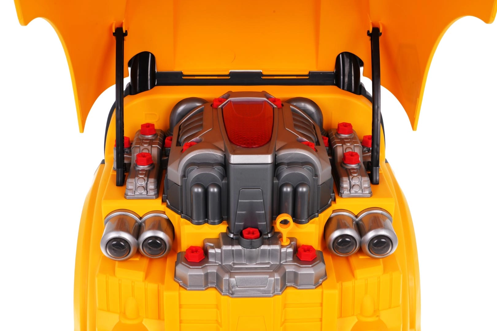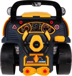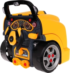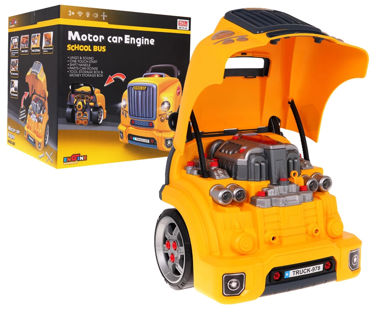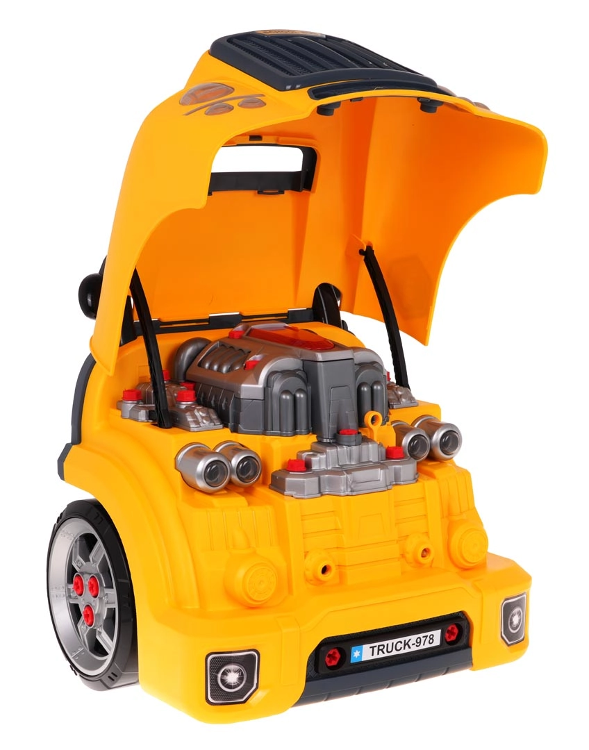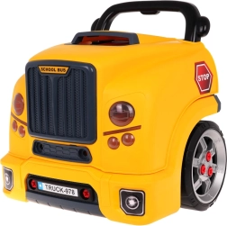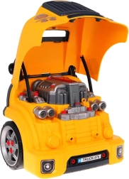 Jucărie interactivă, autobuz școlar galben cu partea frontală dotată cu capotă rabatabilă și bord, concepută pentru copii de la 3 ani. Setul include piese pentru asamblarea părții frontale a autobuzului și unelte necesare pentru montarea și demontarea componentelor, precum șurubelniță și chei. Sub capota autobuzului se află un motor mare detașabil, pe care copilul îl poate demonta. Se pot înlocui și bujiile și roțile. Pe bord se află un buton de pornire a vehiculului cu sunete de aprindere a motorului, un volan cu claxon și o sirenă de urgență. Sub volan se află un spațiu de depozitare în care pot fi păstrate toate uneltele, șuruburile și butoanele necesare. Jucăria are un mâner comod pentru transport. Alimentare cu 3 baterii AA 1,5 V (nu sunt incluse). Această jucărie pentru micii mecanici auto dezvoltă îndemânarea manuală, motricitatea fină și coordonarea mână-ochi. . Funcții: . - capotă rabatabilă a autobuzului, . - motor rotativ, . - sunete de aprindere a motorului, mers înainte, mers înapoi, .- claxon pe volan, .- sirenă de urgență, .- faruri care se aprind, .- lumini ale motorului, .- compartiment pentru unelte, .- levier de viteze, .- mâner confortabil pentru transport, .- ghidon mobil, . |