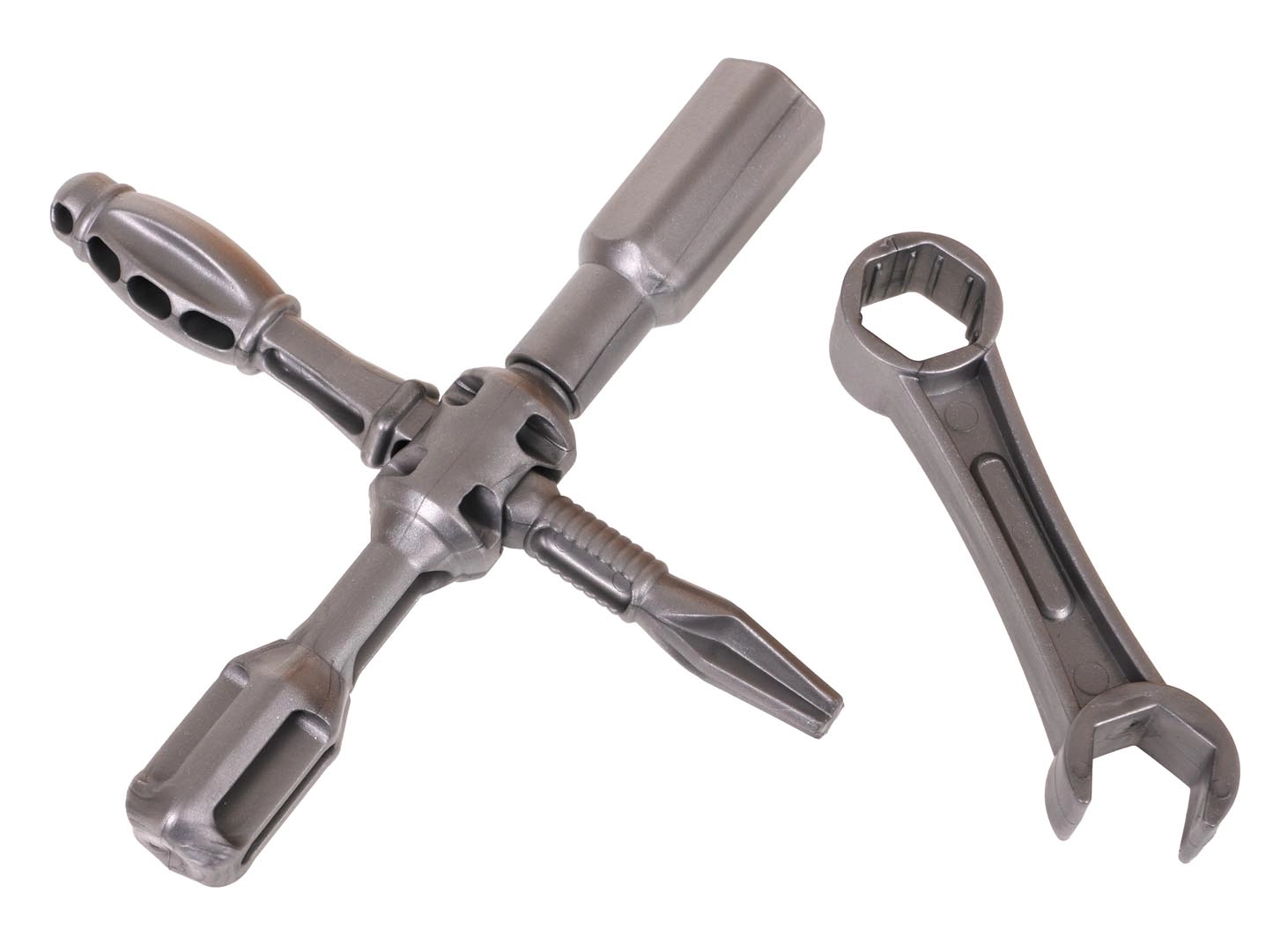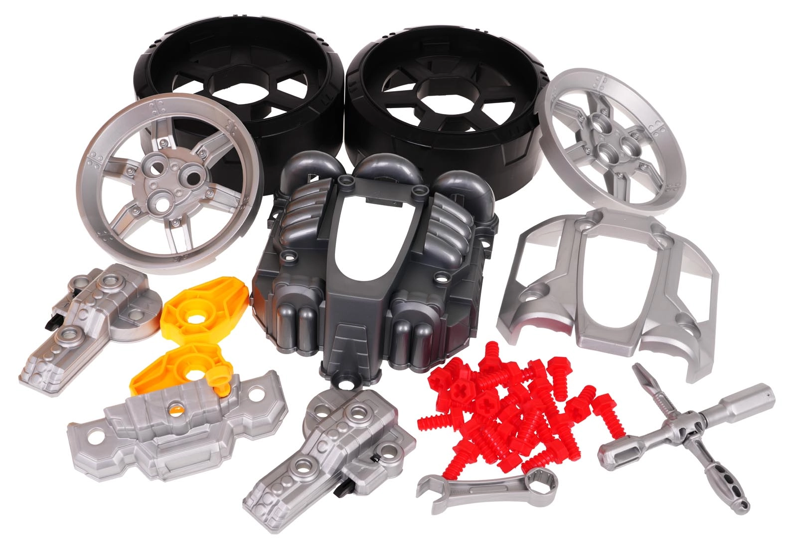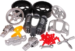 - partea frontală a vehiculului cu motor detașabil, .- roți cu capace, .- șuruburi, .- unelte, .- autocolante decorative, .- instrucțiuni. . |
