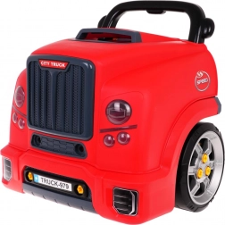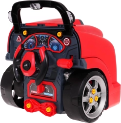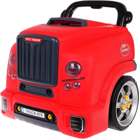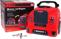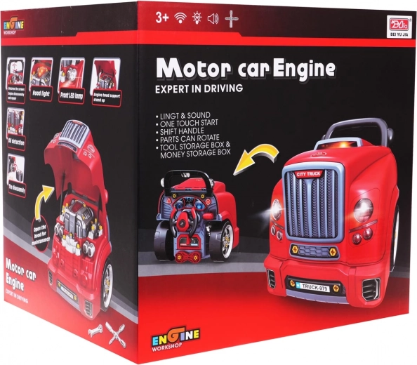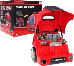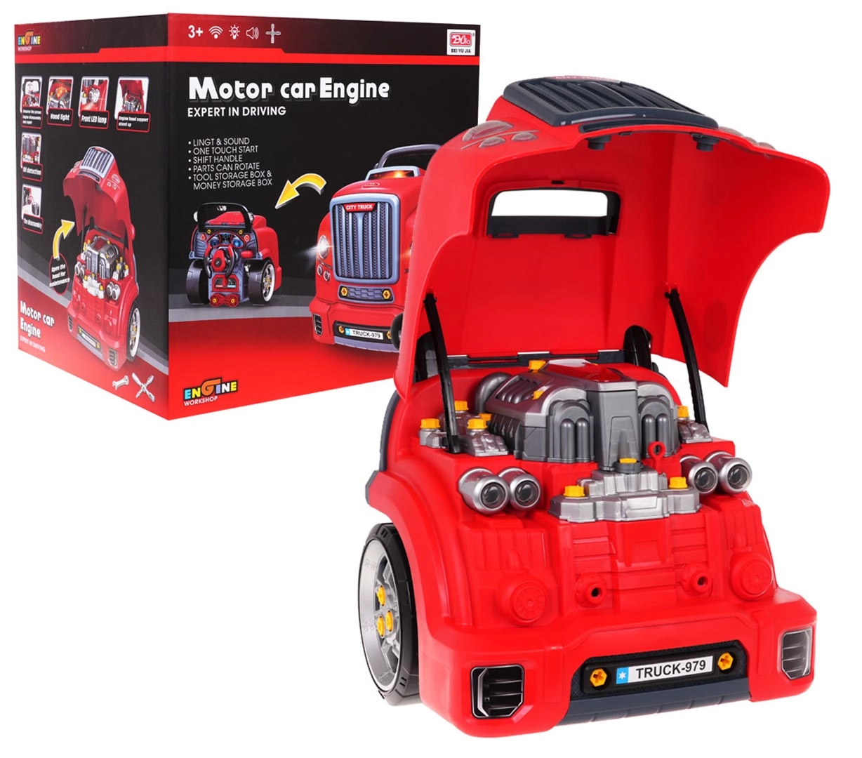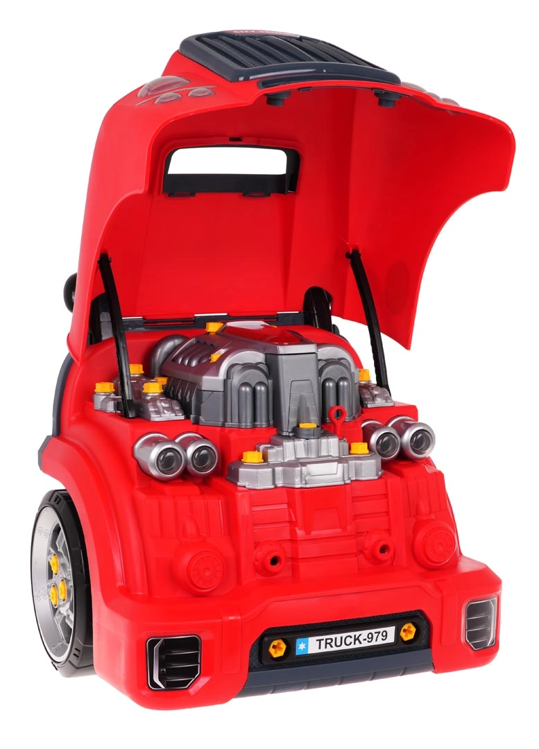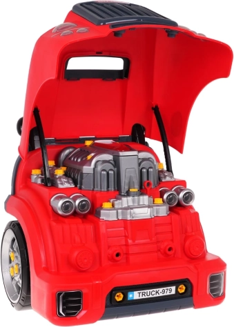 Acest set interactiv realist îi transformă pe copii în mici mecanici pricepuți. Partea frontală a camionului, cu capotă rabatabilă, ascunde un motor mare demontabil, unde se pot schimba bujiile și roțile. Pe tabloul de bord se regăsesc buton de pornire cu sunete de start, volan cu claxon, indicator de avertizare și levier de viteze. Un mâner practic ușurează transportul, iar sub volan se află o cutie pentru unelte și șuruburi.