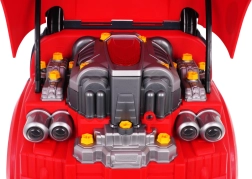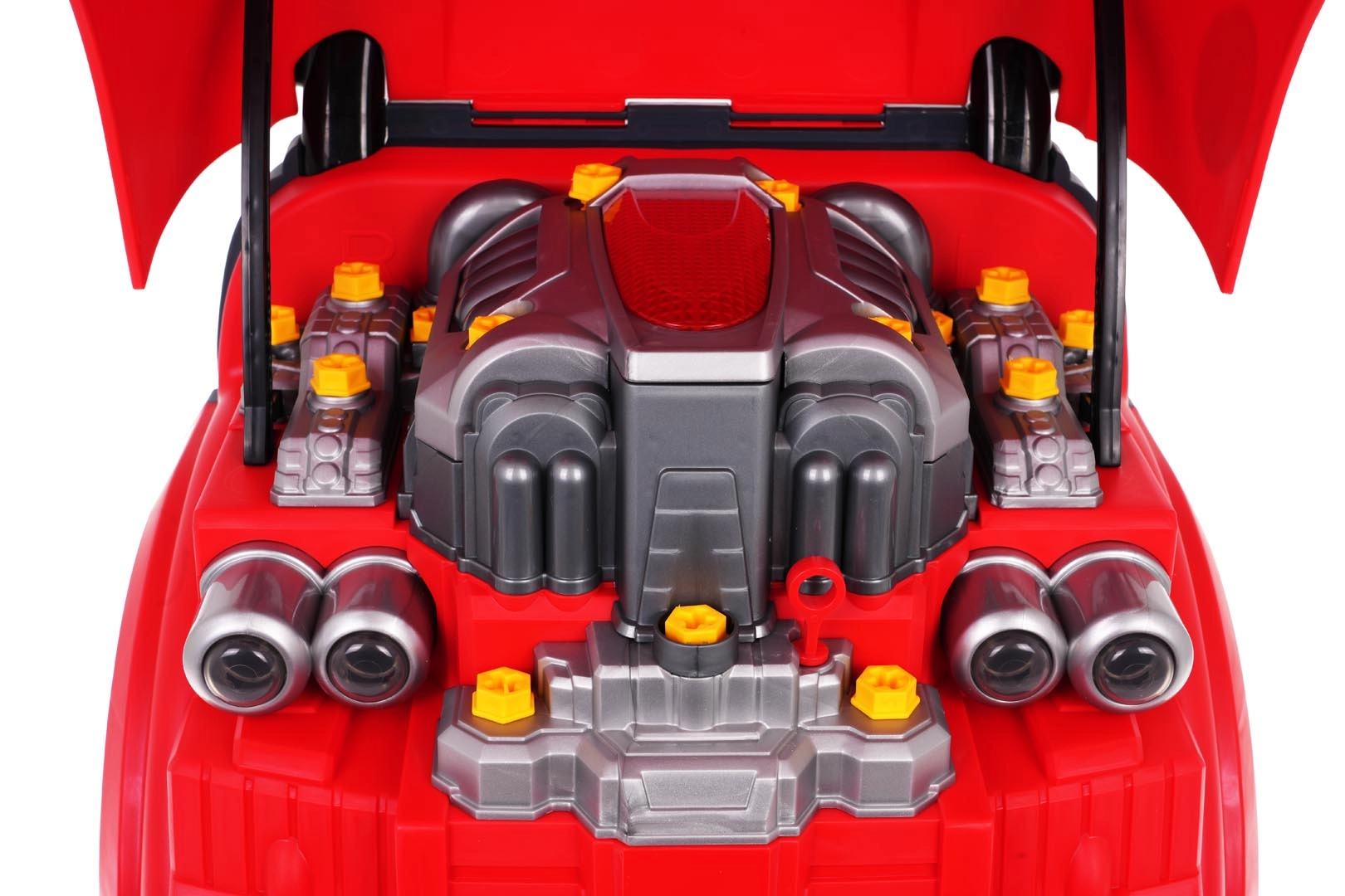Sub capotă se află un motor mare, care poate fi înșurubat și demontat pe piese – ideal pentru antrenarea motricității fine și a logicii.