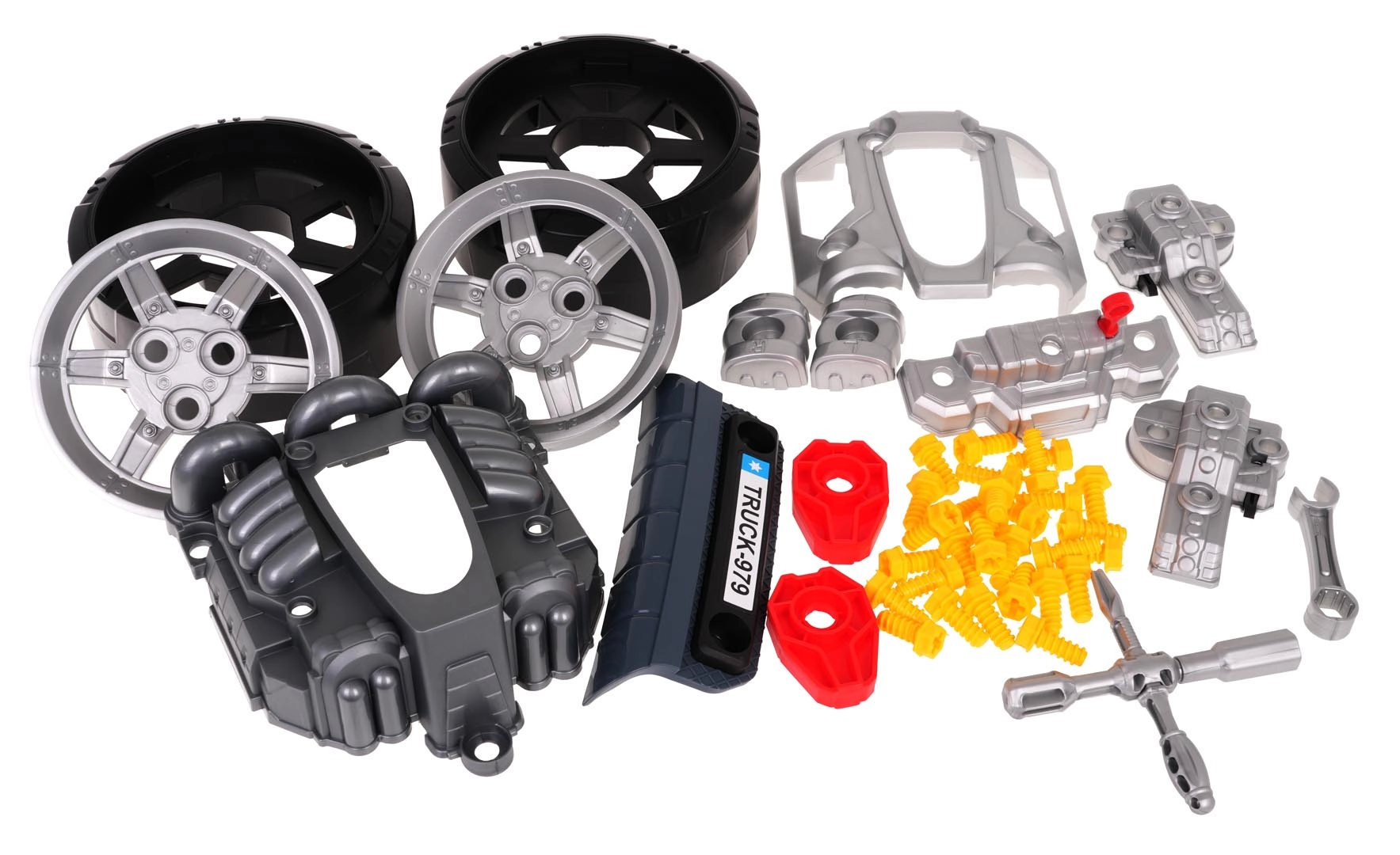- Partea frontală a vehiculului cu motor, roți cu capace, 31 de șuruburi, unelte, autocolante decorative, manual