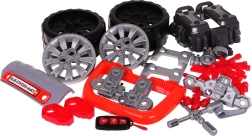 - partea frontală a vehiculului cu motor demontabil, roți cu capace, mini cric pliabil, șuruburi, unelte (de ex. șurubelniță, chei), cheie telecomandă, autocolante decorative, manual