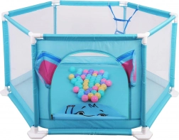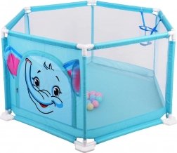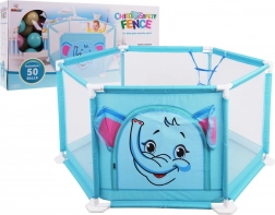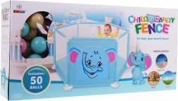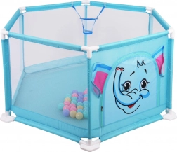 Ţarc pentru copii uşor şi stabil, cu un motiv amuzant cu elefănţel, pereţi transparenţi din plasă şi un set de 50 de bile. Oferă un loc de joacă sigur acasă şi în aer liber, se curăţă şi dezinfectează uşor, iar datorită intrării cu fermoar copiii pot intra şi ieşi singuri. Include şi un mini coş pentru aruncat pentru şi mai multă distracţie.