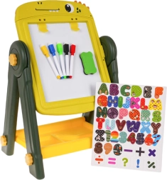 - Setul include un suport pentru cretă, cretă colorată, markere și magneți cu litere, cifre și operații matematice;
