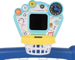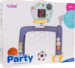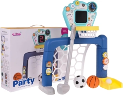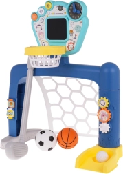 poartă de fotbal cu coș de baschet, .- minge de baschet din cauciuc, .- minge de fotbal din cauciuc, .- minge de golf din cauciuc, .- crosă de golf, .- panou interactiv cu afișaj de puncte și lumini, .- manual de utilizare, .- suport pentru mingi. . |