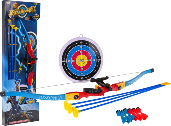 - Set complet – arc, săgeți, săgeți de aruncat și țintă pentru joc imediat.