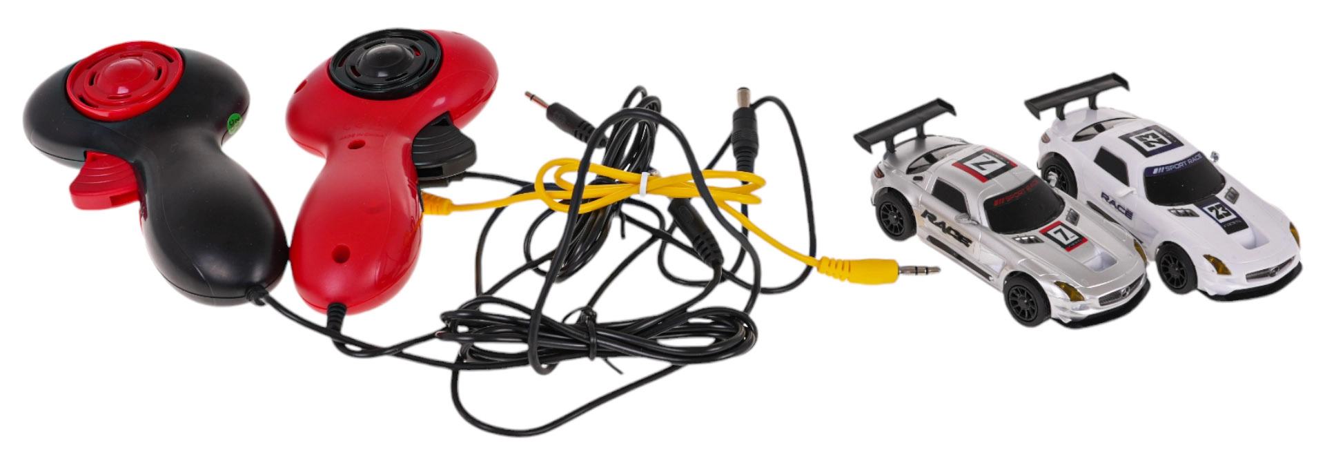 - piese de construcție pentru șine, .- 2 vehicule, .- 2 telecomenzi, - cablu adaptor de alimentare USB . |