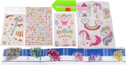- sticlă, .- șnur pentru gât, .- stilou, .- recipient din plastic, .- pătrat adeziv, .- punguță cu 6 tipuri de diamante, .- 1 coală cu motiv unicorn (14 autocolante), .- 1 coală cu diamante (408 diamante), .- 1 coală cu diamante cu compoziție florală, .- 1 coală cu autocolante pentru compoziție, - autocolant cu inscripția Crede în tine. . |