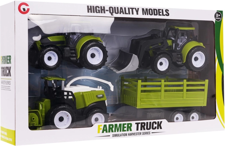 Ce găsiți în set: 2 tractoare (tracțiune spate), combină (tracțiune față) și remorcă ce poate fi atașată la ambele tipuri de mașini. Datorită designului bine gândit, copiii pot încărca, transporta și „recolta” cu ușurință, dezvoltându-și coordonarea și imaginația.