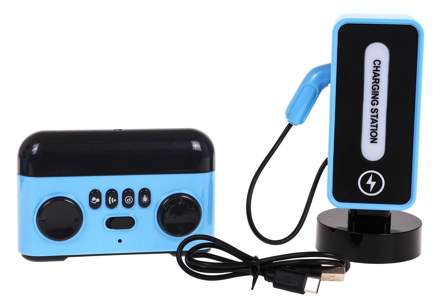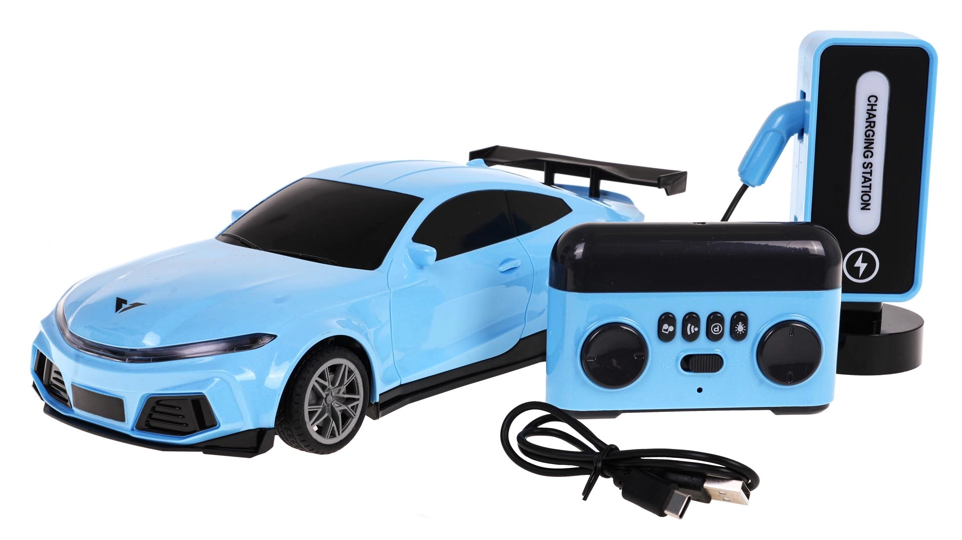 - Mașină RC, stație de încărcare, telecomandă, cablu USB pentru încărcarea stației