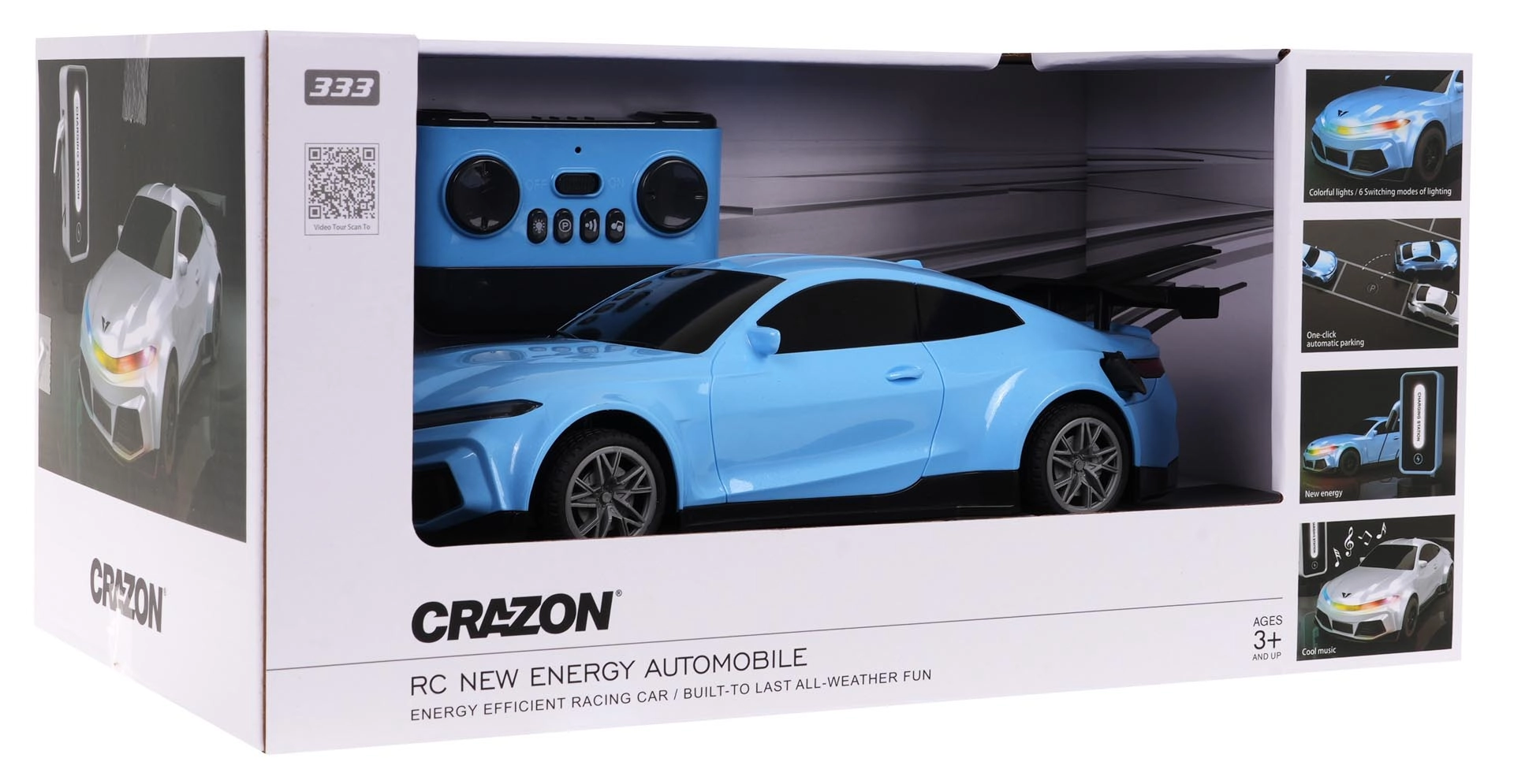 Mașina RC cu control ușor se deplasează în toate direcțiile – înainte, înapoi, dreapta și stânga – iar datorită anvelopelor din cauciuc își păstrează excelent traiectoria. Luminile față și spate luminează și clipesc, iar culoarea poate fi schimbată în mov, roșu sau albastru. Nu lipsesc semnalizările, claxonul și melodiile pentru și mai multă distracție.