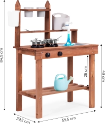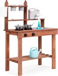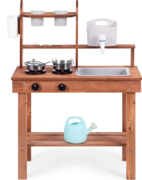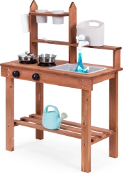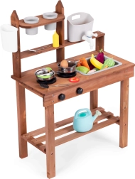 Încurajează jocurile de rol și le permite copiilor să „gătească” din nisip, lut sau pietricele. Rafturile clare și cârligele păstrează vasele la îndemână, iar dimensiunile compacte facilitează amplasarea chiar și în spații mici.