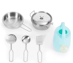 Pachetul conține oală cu capac, tigaie, două spatule, polonic și ceainic – tot ce trebuie pentru mici experimente culinare.