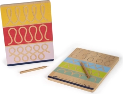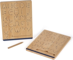 Setul small foot Educate este un instrument ideal pentru preșcolari și școlarii mici care învață primele trasări. Două plăci din lemn cu două fețe oferă patru exerciții diferite: litere, cifre și modele pre-scriere. Urmarea canelurilor frezate cu săgeți învață natural ordinea corectă a trasărilor și susține memoria mâinii.