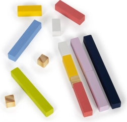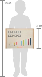 - Conținutul setului: planșă pentru calcul, cubulețe, prisme și bețișoare colorate, piese din lemn cu numere și semne matematice.