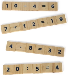 Plăcuțele din lemn cu ecuații și numere îi motivează pe copii să rezolve singuri și să repete rapid.