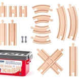 Setul practic conține 20 de bucăți de șine din lemn pentru trasee de trenulețe, depozitate într-o cutie robustă din plastic pentru o stocare ușoară. Extensie ideală pentru trenulețele copiilor, potrivită de la 3 ani și cu conformitate CE.