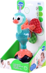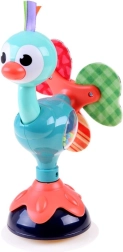 Drăgălașul păun combină piese din plastic neted și elemente textile moi pe coadă, oferind bebelușului texturi și stimuli variate. După fixarea cu ventuza, jucăria se rotește în jurul axei proprii și, în mișcare, produce sunete fine de zornăit care îi motivează pe cei mici să prindă și să exploreze.