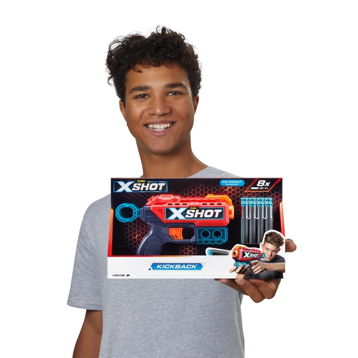 Lansatorul X-Shot Kickback este conceput pentru viteză și agilitate, fără a pierde din precizia și forța tragerii. Cu el, te întorci rapid în acțiune datorită capacității de a lansa o săgeată până la 27 metri. Bucură-te de distracția realistă datorită funcției de recul, care simulează tragerea reală!