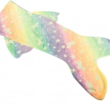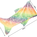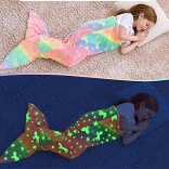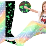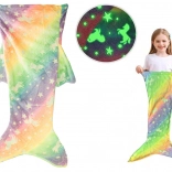 Pătură pentru copii în formă de coadă de sirenă, în culori curcubeu, cu modele de unicorni și steluțe. Este extrem de moale și călduroasă, ideală pentru relaxare, citit sau vizionarea poveștilor. Modelele strălucesc în întuneric după stingerea luminii, transformând fiecare seară într-o aventură magică. Fleece-ul catifelat asigură căldură și confort, iar designul jucăuș stimulează imaginația și veselia.
