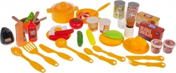 Tigaie, oală, farfurii, tacâmuri, condimente și alimente de jucărie – totul atent asortat pentru ore întregi de joacă creativă.